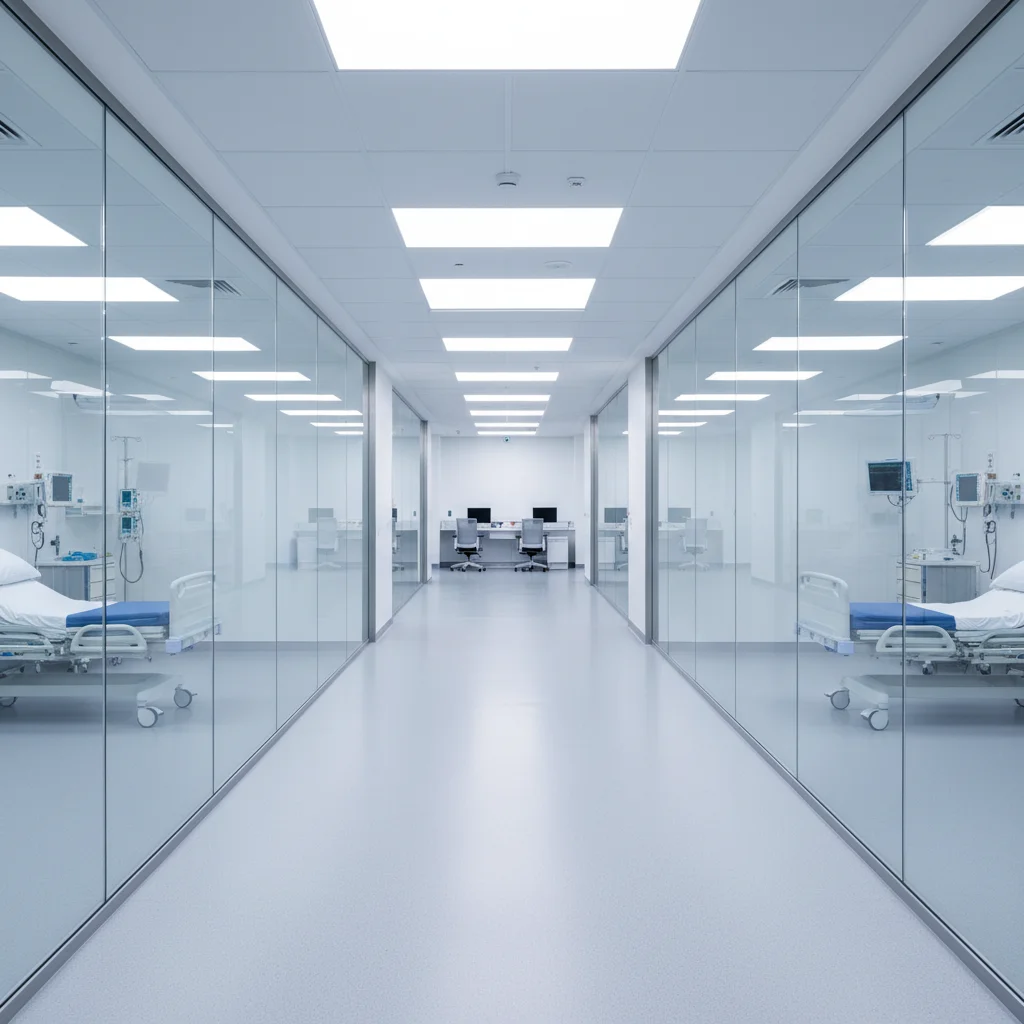 Противопожарные перегородки и двери, гигиеничные алюминиевые системы, smart-стекло для приватности. Сертифицированные конструкции для больниц, клиник и медицинских центров.